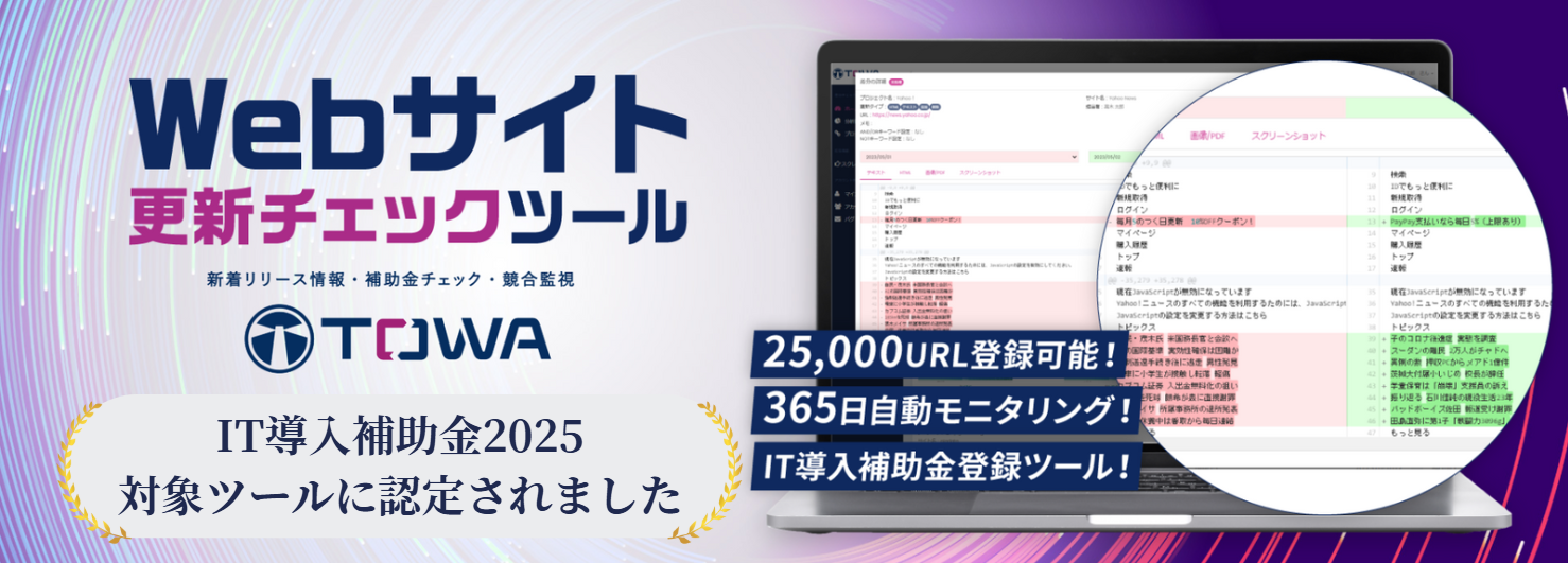 「TOWA」は、Webサイトの更新や情報の変化を自動で検知・通知するツールです。