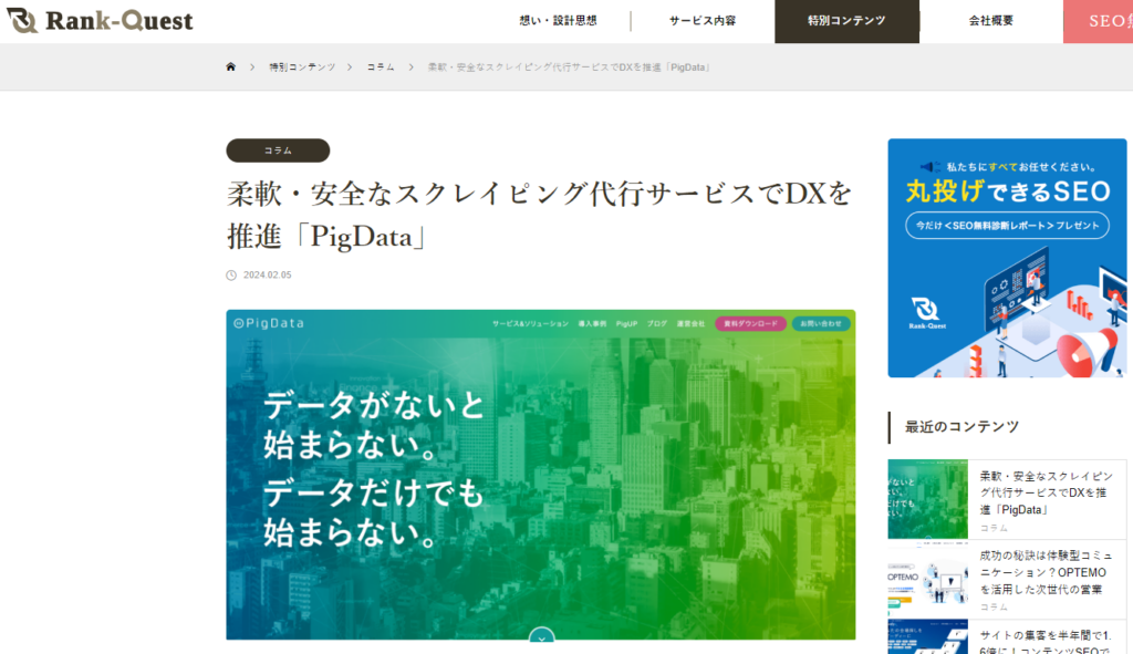 PigDataスクレイピング代行サービスが「Rank-Quest」に掲載されました。スクレイピング代行サービスの魅力や詳細がまとめられています。
